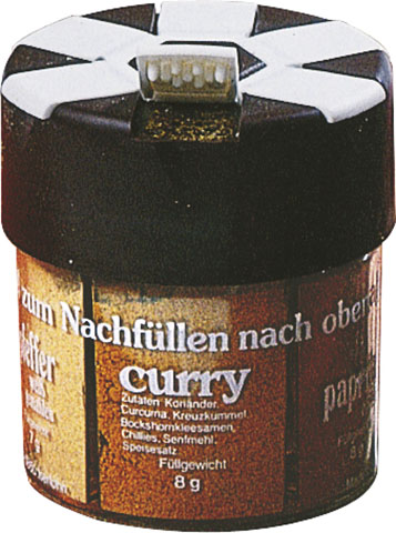 - Den klassiska sexdelade kryddburken innehåller bordssalt (35 g), söt paprika (8 g), curry (8 g), vitlökssalt (8 g), vitpeppar (7 g), svartpeppar (6 g).