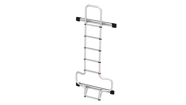 infästning på vänster bakdörr på LMC Tourer. På grund av den speciella formgivningen förblir registreringsskylten fri. Monteringsskenorna är skruvade eller limmade. Den bakmonterade stegen kännetecknas av de breda, glidsäkra stegen för en säker uppstigning. Kombinerbar med Carry-Bike 200 DJ (86922).
