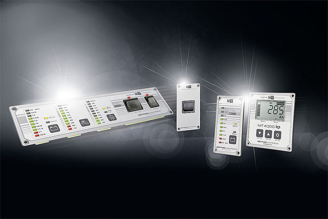 Visar start-/inbyggd spänning samt nivå för färskvatten-/avlopps-/fekalietankar. Huvudbrytare (16 A) och integrerad* pumpbrytare (10 A).