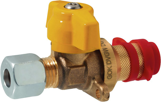 Kulventil som avstängningsventil med säkerhetskoppling för installation i rörledningen som anslutningsalternativ till bärbara gasapparater som t.ex. gasspis eller gasgrill med fästkonsol, Utförande genomgång med huvmutter typ M och skärring typ DU RVS 8 x SKU STN.