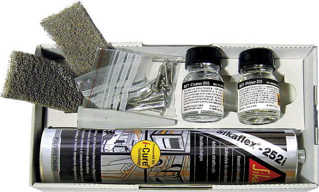 För fastklistring av profilen på taket. Aktivator 205, primer, 210T, Sikaflex 252i, skruvar i rostfritt stål, modulinfästning, tillbehör, klisteranvisning.