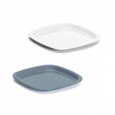 Kvadratisk assiett med rundad form i SAN-plast. Travbar för effektiv förvaring i köksskåpet.