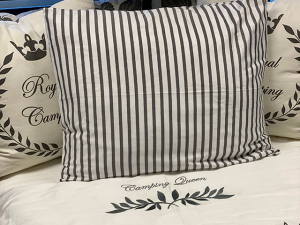 100% bomullssatin bestående av örngott och påslakan. Mjuka och behagliga påslakan som känns sköna mot hud och ger en extra ”lyx- och hemmakänsla” i husbil och husvagn vart man än befinner sig! Vitt påslakan och örngott med grå linjer. Camping King är broderat.