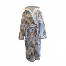 Mjuk, behaglig och färgglad badrock med campingmotiv. Material: utsida microfiber rPET / insida 100% bomull Öekotex. För ålder 6-8 år. - Dokument