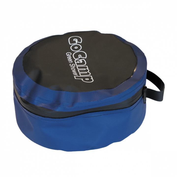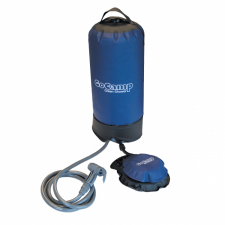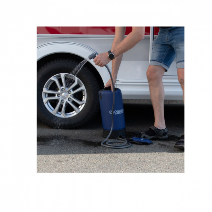 En liten behändig campingdusch i PVC som värms upp av solvärme. Man pumpar med hjälp av fotpump.