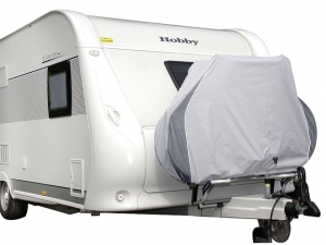 Skyddshöljet är i första hand konstruerat för cykelhållare som är monterade på dragstången, men tack vare sin lådliknande design kan de användas överallt, exempelvis till scootern på lastplattformen. Det dras ner över cyklarna uppifrån. Längs underkanten löper en hålsöm för gummispännbandet som medföljer i leveransen. För att kunna använda den på husbilen finns en genomskinlig ficka för varningsskylten,