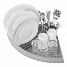 Diskställ med avrinning, utformad för placering i hörn för att minimera platsåtgång.