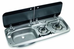 Kombination av tvålågig spishäll och diskho med glaslock. Diskho till vänster.