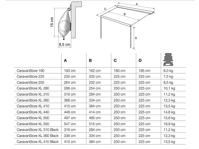 Caravanstore XL förvaras i ett vattentät påse som är försedd med gummimplattor som skyddar husvagnen ifrån repor.