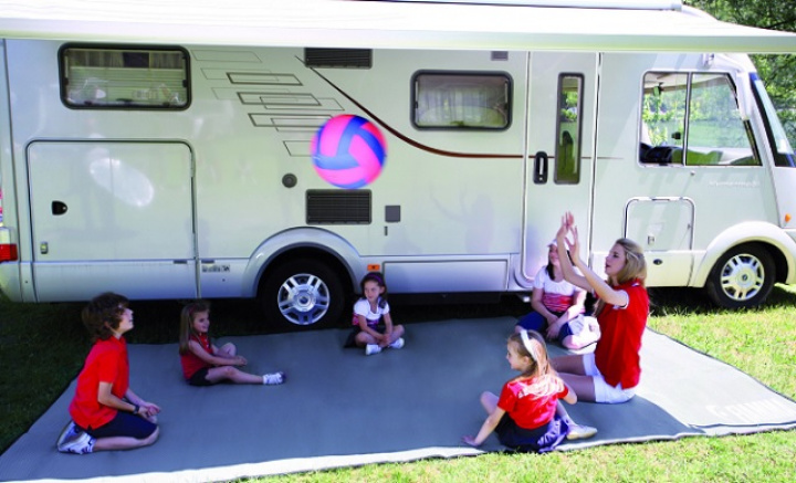 En markismatta som är enkel att göra ren och frakta, den går att skölja av med vatten och hänga upp på tork.