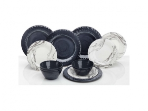 En melaminservis som ger en känsla av stengods. Assietterna går i marmor stil.