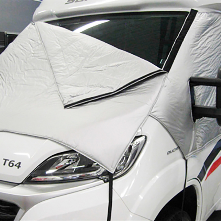 Thermomatta – en idealisk isolerhuv för husbilar. Med möjlighet att öppna så man ser ut genom vindrutan. Kardborreöppning mellan front och gavlar.