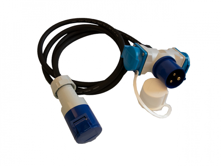 Skarvsladd CEE 230V H07RN-F 3 x 2,5 mm² med CEE anslutning och 2 st grenuttag. Perfekt att skarva ihop med kabeln från elstolpen och fordonets elintag, för att få extra uttag i förtält eller markisrum.