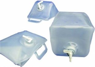 Hopfällbar vattenbehållare med kran. Kan enkelt pressas ihop då den inte används 5 och 10 liters behållaren har ett handtag vardera och 20 liters behållaren har två handtag.