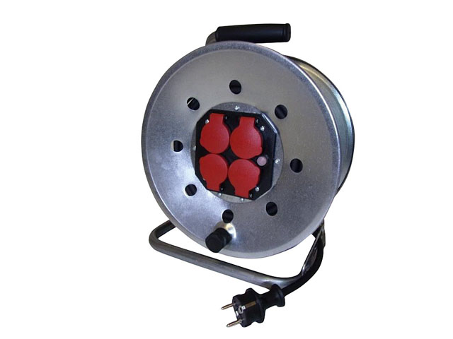 Kabelvinda av stålplåt och förzinkad fot. 25 m gummikabel H 07 RN-F3G1,5, 4 jordade uttag med självstängande skyddslock.