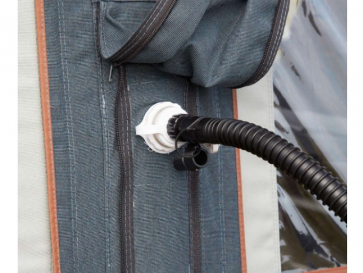 Det pumpas enkelt upp på ett ställe och består av endast luftkanaler vilket innebär att det behövs inga stänger för att täta mot husvagnen.