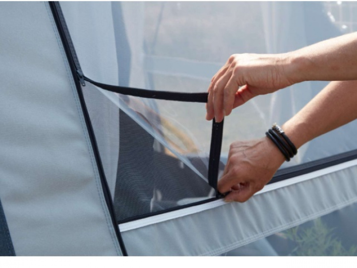 Front och gavel är tillverkad i Isabellas genomfärgade material Isacryl som har mycket god andningsförmåga, samt så står det emot solblekning bra. Gavlarna har fönster som är försedd med myggnät som gör att det blir god ventilation.