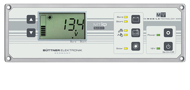 Digitalvisning av: Start-/inbyggd spänning, nivå för färskvatten-/avlopp. Underspänning kan programmeras. Huvudbrytare - funktion, på/av-brytare (pump, ICC m.fl.) Solpanelinfo för alla MT-solregulatorer.
