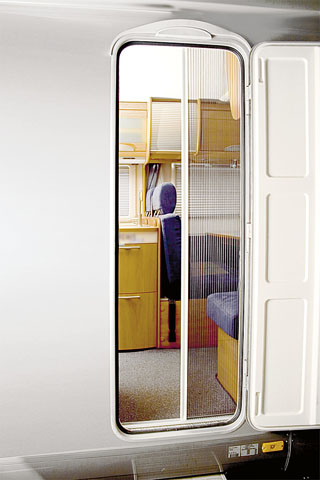 Plissén som försetts med ett ytterst slitstarkt myggnätsmaterial räcker hela vägen ner i styrskenorna. Sidoavslutningarna på den övre och nedre listen förhindrar också att ovälkomna insekter tar sig in. I den nedre dörrlisten kan man dessutom lägga en kabelkanal.