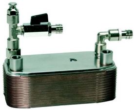Plattvärmeväxlare med förmonterade nipplar, luftskruv och avstängningskran för Ø 16 mm slang samt avstängningskran och luftnippel. - Dokument