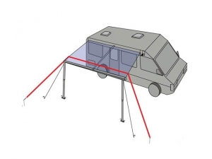De kraftiga stållpinnarna sätts ner i marken. Spänn det långa bandet över ditt förtällt eller din markis. På andra sidan fäster du fjädern och det korta bandet och justerar där efter bandet.