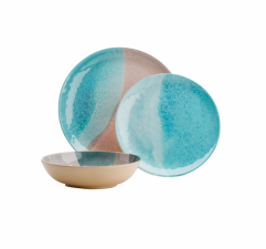 En modern melaminservis med en präglad skinande yta som ger en känsla av stengods men med vikt som melamin.