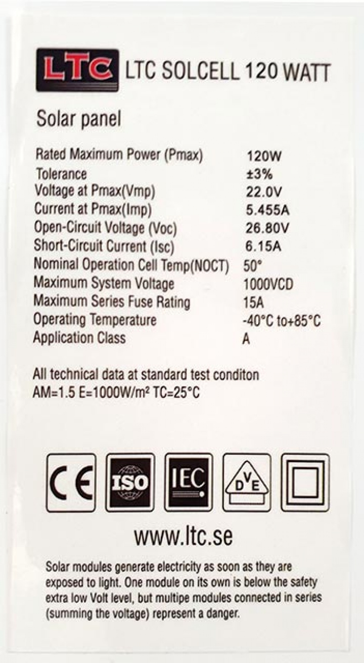120 watts solcellspanel med 6 meter kabel. Måttet passar väldigt bra på husbilar och husvagnar. Solpanelen är tillverkad i monokristalin, framtagen för att klara av nordiska klimat.