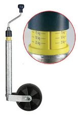 Winterhoff stödhjul med trycklagring och inbyggd kultrycksindikator. När stödhjulet belastas kan man läsa av antal kg på en skala 25–125 kg visar ungefärliga trycket på kulan.