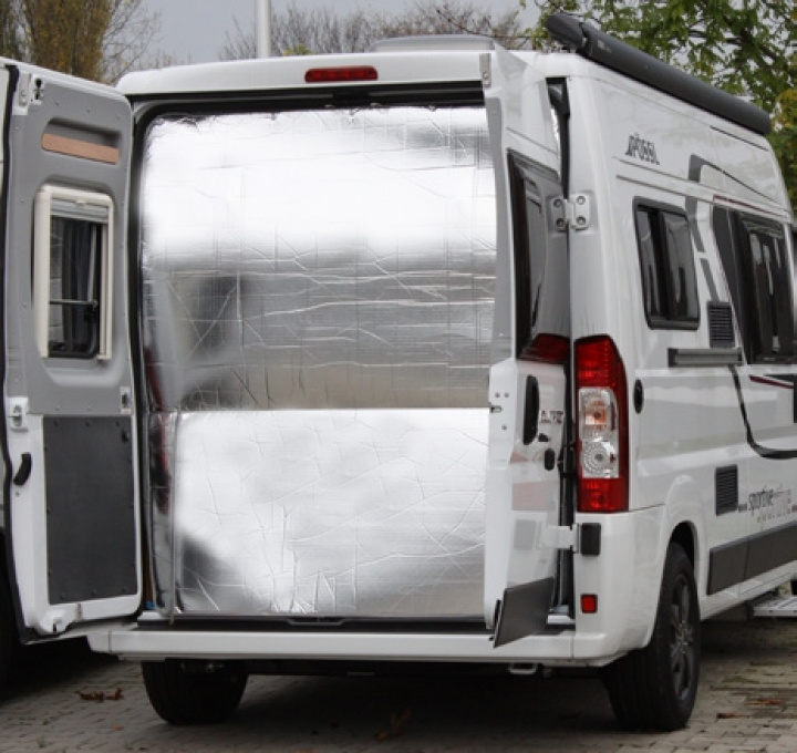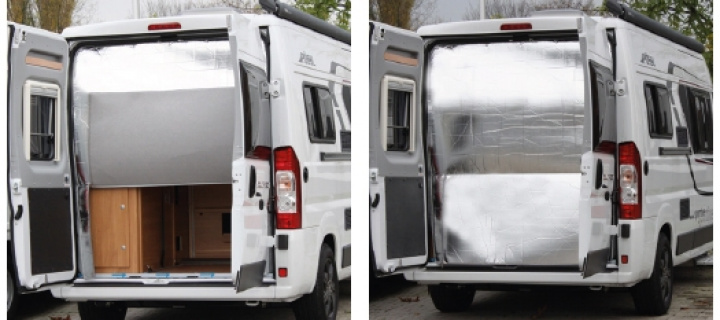 Perfekt passform för bakdörr. Utsidan är fuktavvisande, minskar kondensen inne i bussen. Kan enkelt öppnas med två blixtlås från utsidan. Monteras med hjälp av tryckknappar som sätts fast i bilen. Material 100% polyester. Sandwich-struktur som ger 8mm isolering.