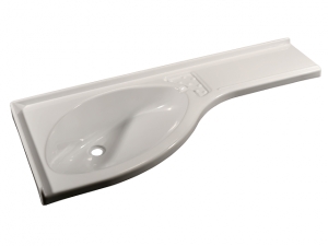 Hörntvättfat med hylla höger, tillverkad i högslagtåligt, matt glänsande och formaldehydfritt polystyrol som är täckt med en skyddsfolie för att undvika repor under monteringen.