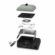 Inkluderar grillplatta, hållare för kaffepanna, kastrullhållare och ett stänkskydd som även fungerar som vindskydd.