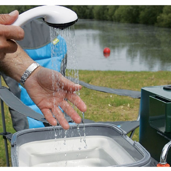 Mobil varmvattenberedare Kampa Geyser som ger varmvatten via en kran eller ett duschmunstycke.