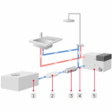 Därefter går vattnet vidare till en T-koppling och därifrån som kallvatten till kök och dusch och till Alde Värmepanna.