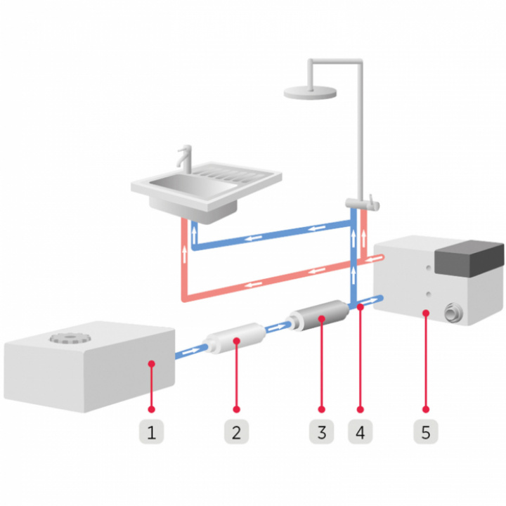 Tryckfallet över Alde AquaClear är upp till 0,9 bar, så det rekommenderas en färskvattenpump med ett tryck på minst 2 bar.