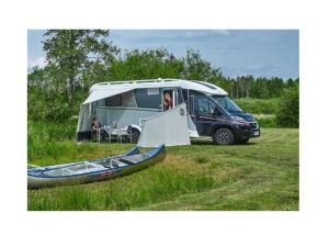 Kan med fördel användas tillsammans med Cosy Corner Levo. Man placerar bara vindskyddet på Cosy Corners bärande stång. Eller så går det utmärkt att montera direkt på husbilen eller ha som fristående. Tillverkad i IsaLite som är ett lättskött material.